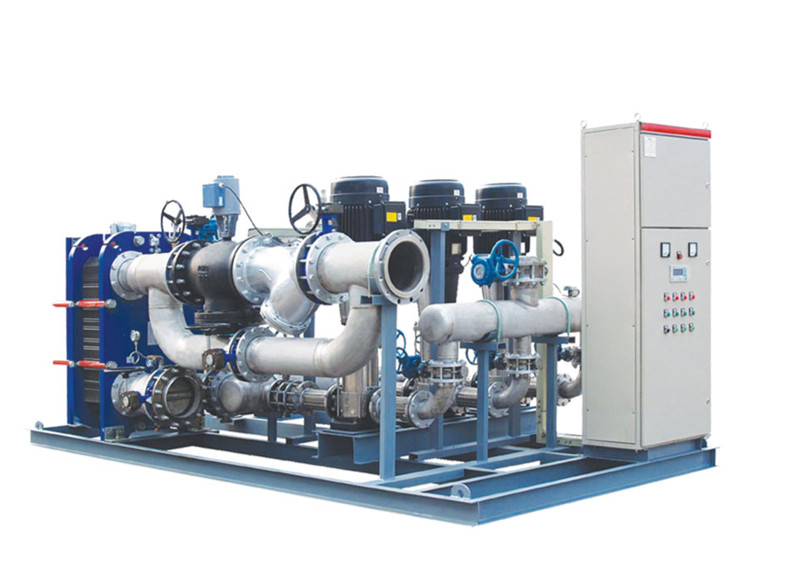 換熱機(jī)組的構(gòu)成及工作原理?yè)Q熱機(jī)組是集成板式換熱器、循環(huán)泵、補(bǔ)水泵、電控柜、溫控裝置、各種傳感器、熱量計(jì)、溫度計(jì)、壓力表、管路和閥1門等于- -體,并組裝在公共底座上的熱交換成套組合裝置。一次側(cè)熱源(蒸汽、高溫水等),經(jīng)過除污器過濾后,進(jìn)入板式換熱器與二次側(cè)循環(huán)水進(jìn)行熱交換,然后返回一次側(cè)回水管網(wǎng)。二次側(cè)循環(huán)水經(jīng)過除污器過濾、循環(huán)泵加壓后,進(jìn)入板式換熱器與一次側(cè)熱源進(jìn)行熱交換,然后進(jìn)入二次側(cè)供水管...